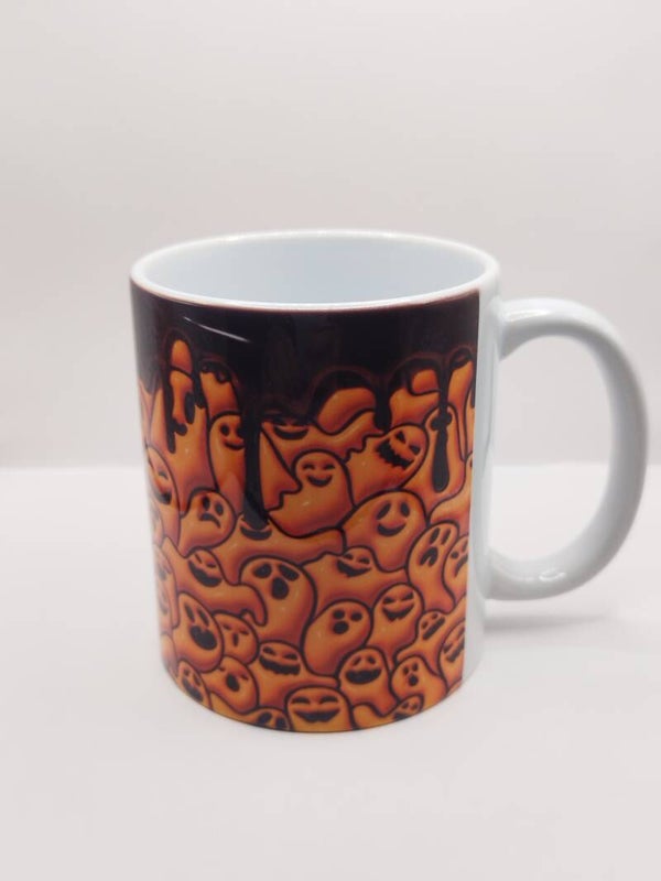 Apportez une touche fun et gourmande à vos pauses café avec ce mug en céramique décoré d’un motif de petits fantômes fondants, dans des tons orange et noir.